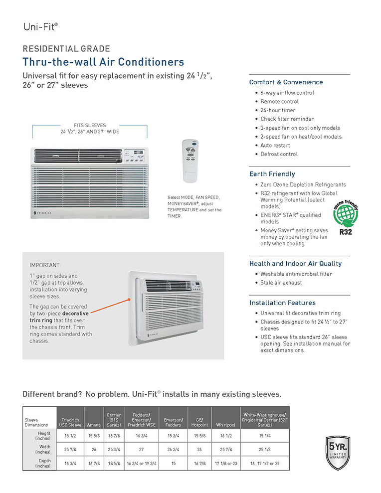 Thru-wall air conditioners were developed in the late 1950's. Over the next forty years many companies engineered, manufactured and installed a variety of different units throughout the United States and Canada. Today, a number of these companies are no longer in business or have discontinued their line of thru-wall air conditioners and no longer carry replacement parts. Metro AC offers replacement air conditioners and heat pumps that are interchangeable with units no longer available from the original manufacturer. These units are engineered to fit perfectly within the existing wall sleeve, thereby reducing installation time and expense.